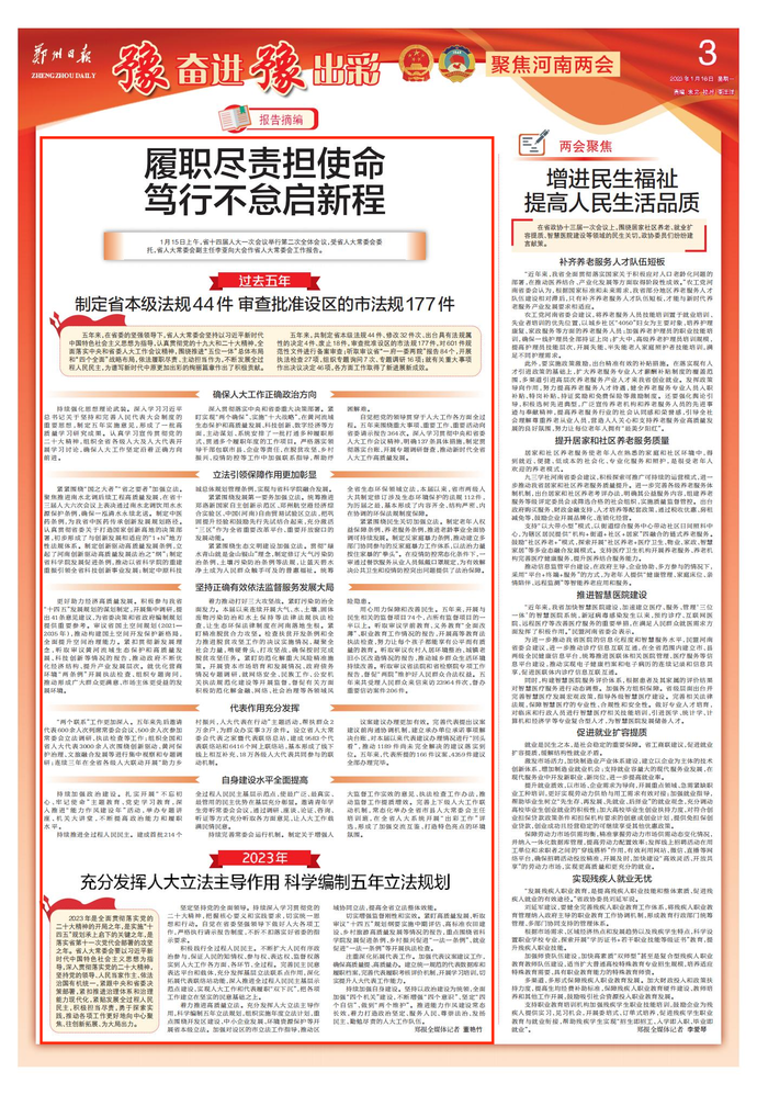 紧紧围绕“国之大者”“省之要者”加强立法。聚焦推进南水北调后续工程高质量发展,在省十三届人大六次会议上表决通过南水北调饮用水水源保护条例,确保一泓清水永续北送。制定中医药条例,为我省中医药传承创新发展规划路径。认真贯彻省委关于打造国家创新高地的决策部署,初步形成了与创新发展相适应的“1+N”地方性法规体系。制定创新驱动高质量发展条例,立起了河南创新驱动高质量发展法治之“纲”;制定省科学院发展促进条例,推动以省科学院的重建重振引领全省科技创新事业发展;制定中原科技城总体规划管理条例,实现与省科学院融合发展。
