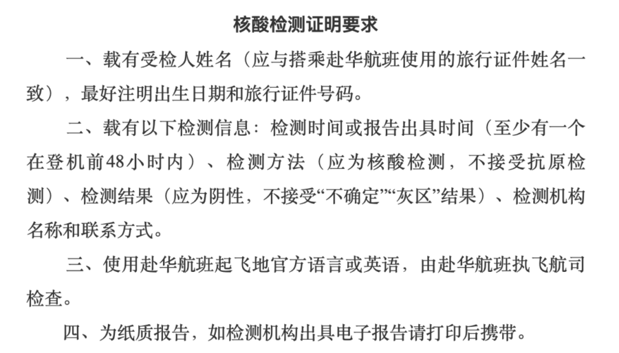 为确保国际旅行健康安全,自2023年1月17日起(当地时间),执飞赴华航班的航空公司将负责查验旅客登机前48小时内核酸检测阴性证明,请予以配合。中国海关将在旅客入境时对证明进行抽查。