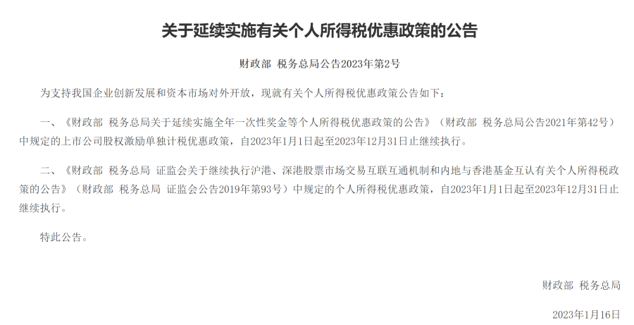 一、《财政部税务总局关于延续实施全年一次性奖金等个人所得税优惠政策的公告》(财政部税务总局公告2021年第42号)中规定的上市公司股权激励单独计税优惠政策,自2023年1月1日起至2023年12月31日止继续执行。