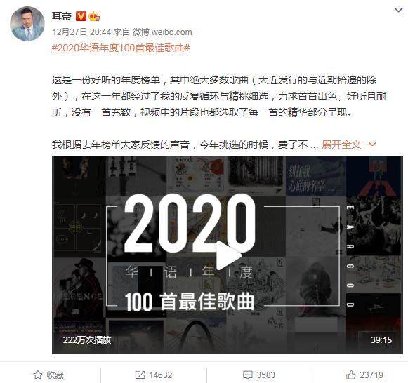 27日,微博知名音乐博主“耳帝”发布了2020年度100首最佳歌曲总结,评论区有人说,100首里面一首都没听过,有人说,“如果你把这些歌都听一遍,或许对华语音乐会有新的认识”。