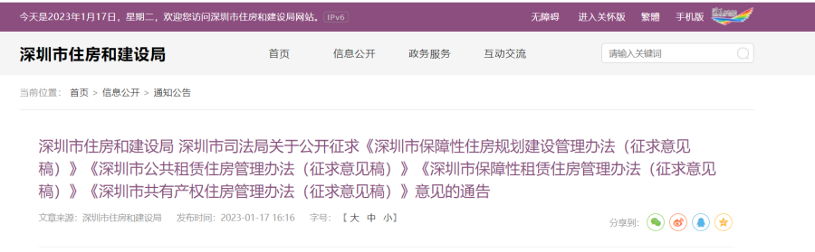 1月17日下午,深圳市住建局官网接连发了4份与保障性住房相关的征求意见文件。