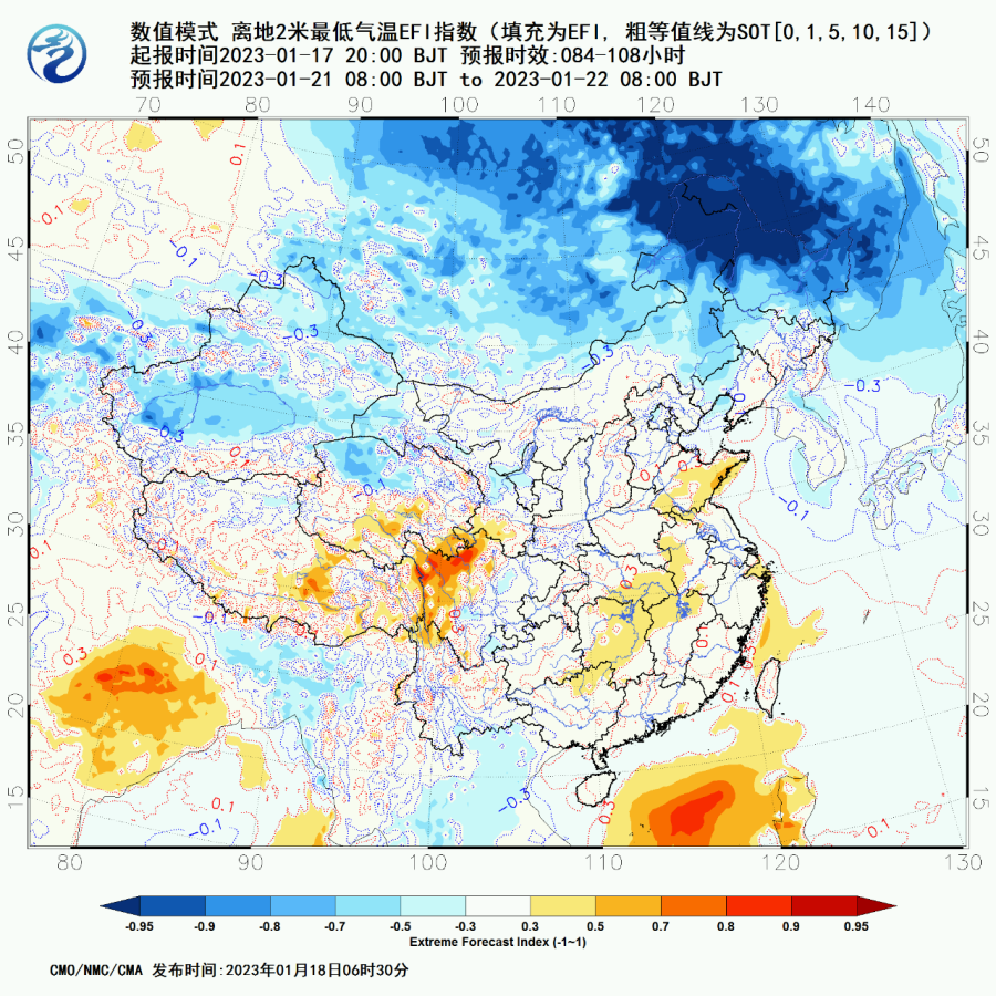 ↑从中央气象台数值预报来看,内蒙古东北部、黑龙江北部21至22日EFI指数为-0.9甚至更低,说明偏冷程度同期少见甚至可能破纪录。