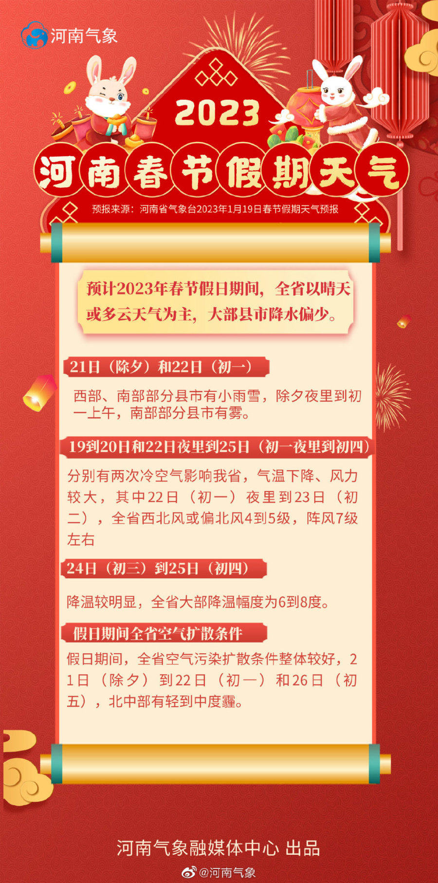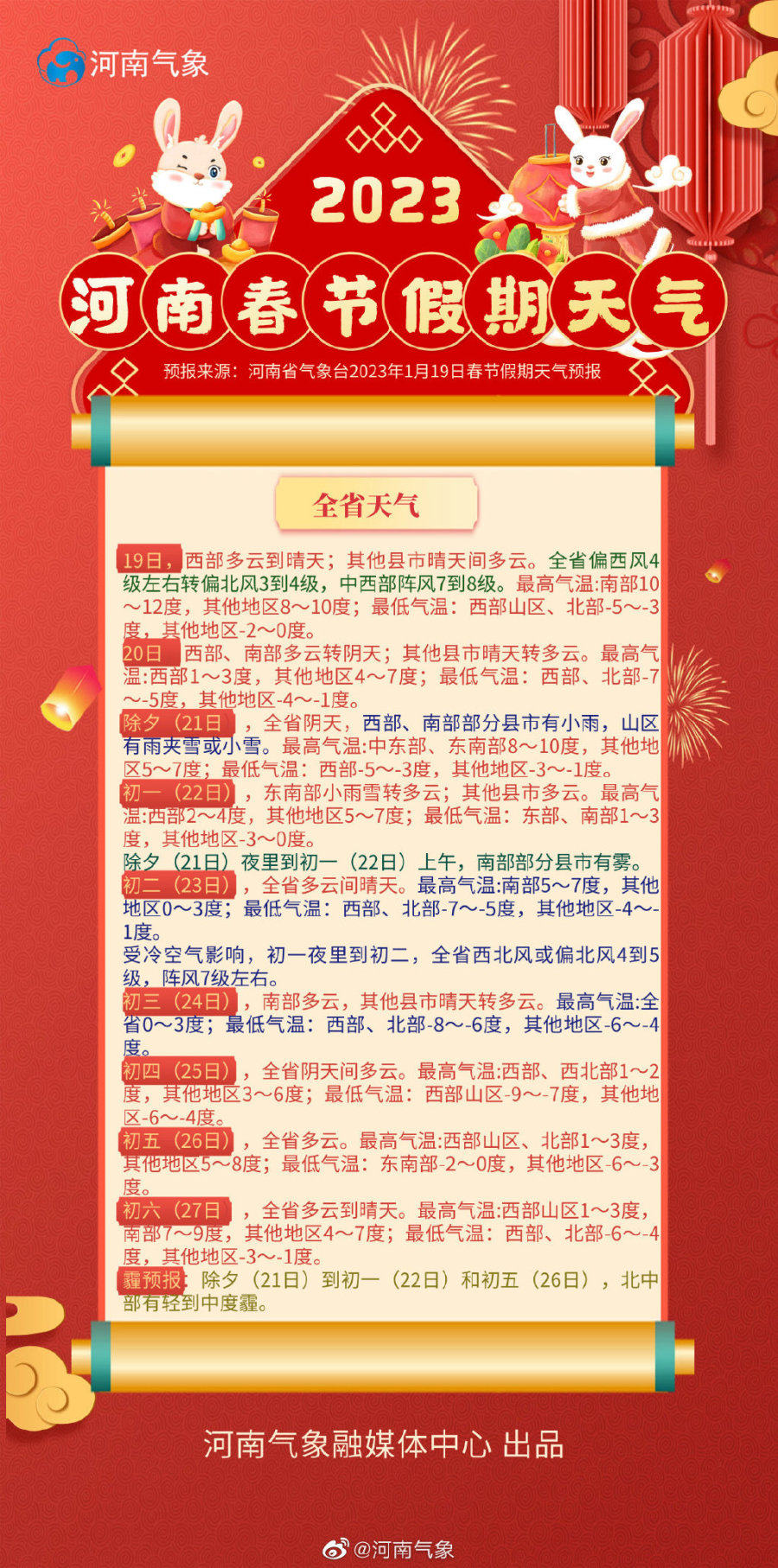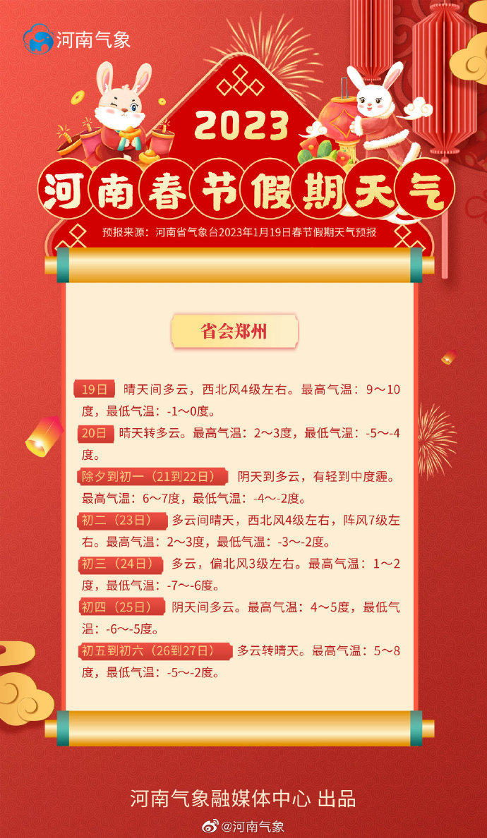 2023年河南春节假期天气来啦! 预计2023年春节假日期间,全省以晴天或多云天气为主,大部县市降水偏少。