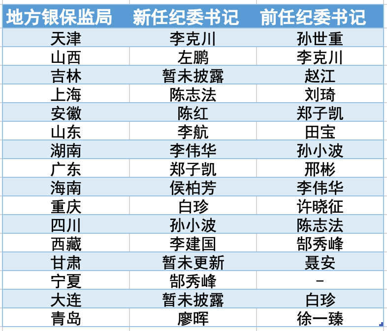 也有一些地方银保监局原纪委书记,在调整后出任副局长职务。天津银保监局原纪委书记孙世重调任山东银保监局副局长后,山西银保监局纪委书记李克川接任天津银保监局纪委书记一职。吉林银保监局纪委书记赵江则调任河北银保监局排名第一的副局长。目前,吉林银保监局暂未披露新任纪委书记情况。