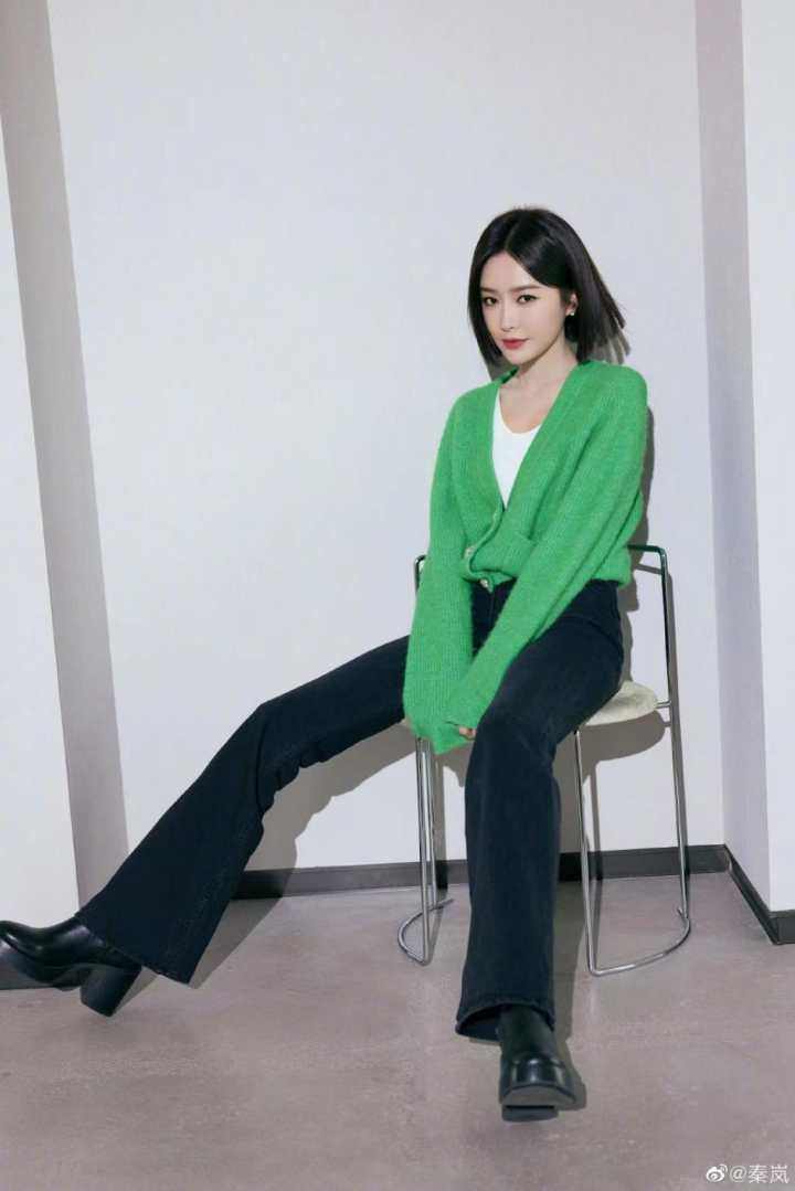 在小品《上热搜了》中,演员秦岚以绿色开衫毛衣配牛仔裤短靴的造型,搭配上简洁干练的短发,让观众眼前一亮。
