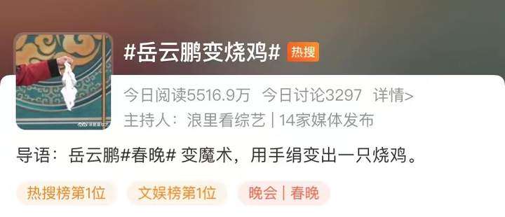 还有哪些春晚同款,另辟蹊径冲上热榜?春晚开始不久,没想到,让网友们追捧的热搜,是一只用手绢变出的烧鸡。作为春晚常客,岳云鹏、孙越在相声《我的变、变、变》当中,居然“大变烧鸡”,并第一时间冲上微博热搜榜第一位。