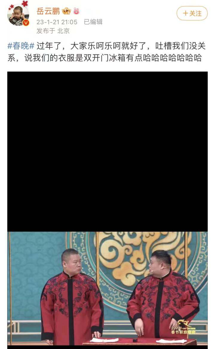比如,昨晚,岳云鹏发微博回应网友,“过年了,大家乐呵乐呵就好,吐槽我们没关系,说我们的衣服是双开门冰箱有点哈哈哈哈哈。”网友回复,“一说更像了,看着更饿了。”