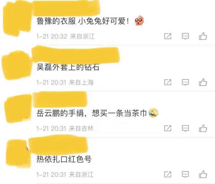 网友们的回答五花八门,从烧鸡、小朋友的帽子、万茜的毛衣、热依扎的口红色号到岳云鹏的手绢。