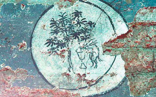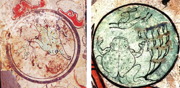 图4:汉代墓葬壁画中的月中蟾蜍和兔子形象(左:洛阳浅井头西汉墓,右:洛阳磁涧里河西汉墓,洛阳古代艺术博物馆藏)