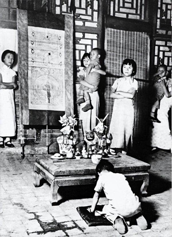当时市场上会售卖一种“月光纸”,上面绘有一轮圆月,药师如来佛的右胁侍月光菩萨盘腿而坐,他能迁变众生苦厄,免除一切障难与病痛。在他身后,广寒宫桂殿中的兔子正站着捣药。这种“月光纸”尺寸大小不一,其中做工精美的金碧缤纷。妇人们买回家后,在月光神位向月亮出现的方向供奉祭拜,然后会烧掉“月光纸”,并将供品撒遍家中。由于妇人们在焚烧月光纸的时候,身边的孩童会在一旁捣乱,为了避免发生危险,于是有人就给孩子们制作了泥塑兔子像,孩子们便也学着大人祭拜起来,正如张朝墉在《燕京岁时杂咏》中写道:“蟾宫桂殿净无尘,剪纸团如月满轮。别有无知小儿女,烧香罗拜兔儿神”。