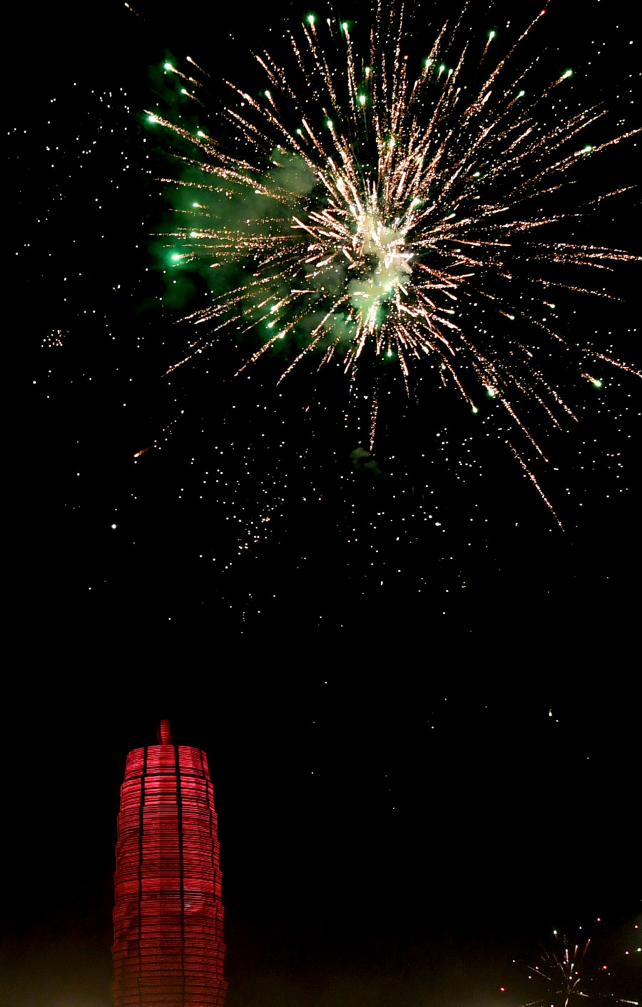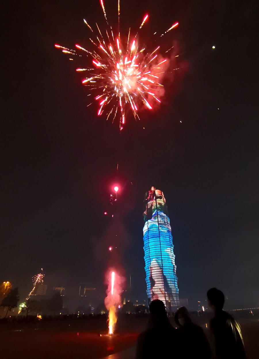 大年初一夜,郑东新区CBD千玺广场大玉米流广溢彩,如意湖文化广场烟花璀璨,众多市民在广场安全地带燃放烟花,节日气氛欢乐祥和。
