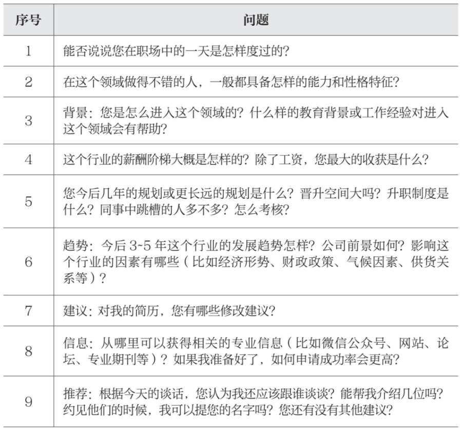 除了这份清单上的人,也可以在后续聊天时请他们继续帮你推荐一些可以咨询的朋友,特别是行业里的牛人,扩大自己的请教范围,特别是你重点想了解的行业或者职业,哪怕争取到15-20分钟的电话沟通也是很不错的机会。