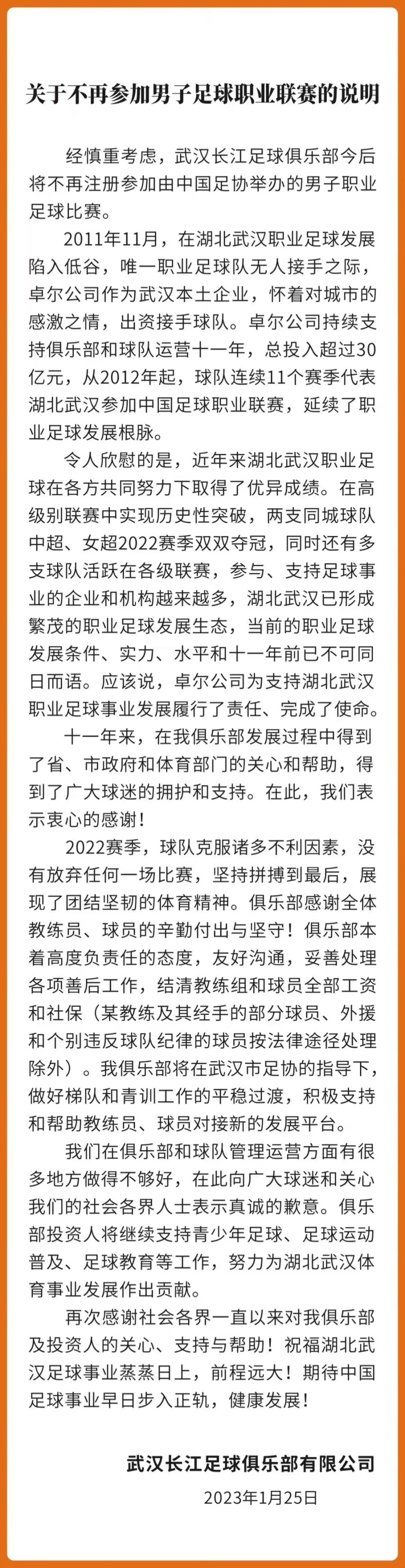 武汉长江足球俱乐部今日官方发文宣布解散,今后将不再注册参加由中国足协举办的男子职业足球比赛。全文如下: