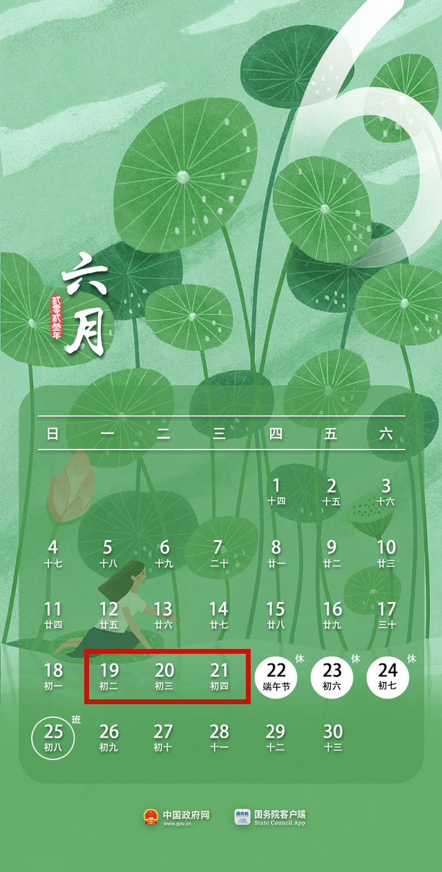 如果你在6月19日到6月21日请假3天,再加上6月17日和6月18日周末,跟端午假期相连,就能形成8天长假。