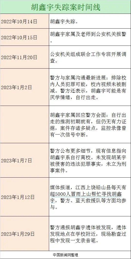从去年10月14日从校内蹊跷失踪,到当地多次组织开展调查搜寻工作未果,再到遗体在学校附近被发现。失踪的106天内,胡鑫宇究竟经历了些什么?此前的大规模搜寻为何没能从学校附近的树林里发现遗体?勘查过程中发现录音笔里又有什么?对此事件,有不少网友提出了疑问,我们重新梳理了时间线,希望从中能找出更多细节来。
