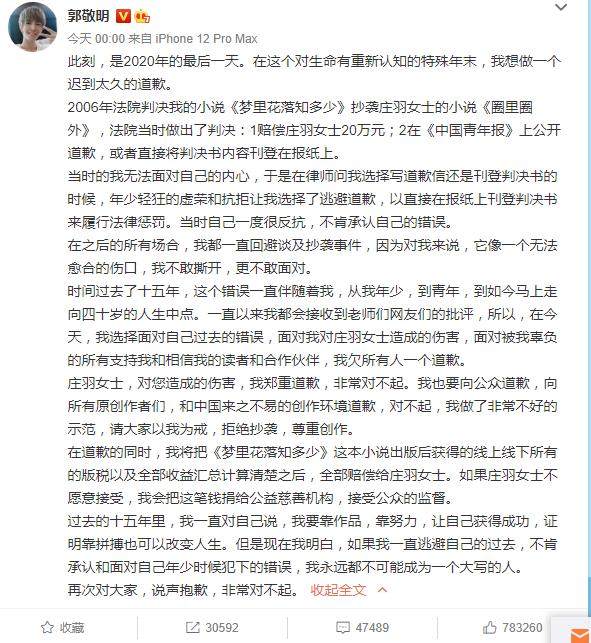 2020年12月31日凌晨,郭敬明就当年小说《梦里花落知多少》抄袭庄羽的作品《圈里圈外》一事在微博上道歉,并表示将把《梦里花落知多少》的版权收入全部赔偿给庄羽女士,“如果庄羽女士不愿意接受,我会把这笔钱捐给公益慈善机构”。