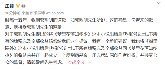 对此,庄羽回应称,接受这份迟来的道歉。此外,庄羽提议将《圈里圈外》以及《梦里花落知多少》的所有版税和收益合并在一起,成立一个反剽窃基金,用以帮助原创作者维权,并接受公众的监督。