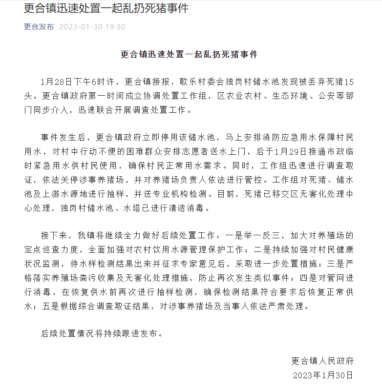 事件发生后,更合镇政府立即停用该储水池,马上安排消防应急用水保障村民用水,对村中行动不便的困难群众安排志愿者送水上门,后于1月29日接通市政临时紧急用水供村民使用,确保村民正常用水需求。同时,工作组迅速进行调查取证,依法关停涉事养猪场,并对养猪场负责人依法进行管控。工作组对死猪、储水池及上游水源地进行抽样,并送专业机构检测。目前,死猪已移交区无害化处理中心处理,独岗村储水池、水塔已进行清洁消毒。
