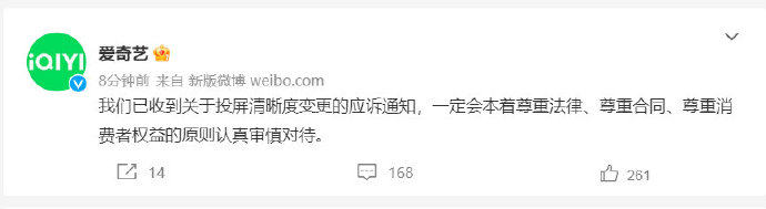 2月1日,@爱奇艺 发文回应称:“我们已收到关于投屏清晰度变更的应诉通知,一定会本着尊重法律、尊重合同、尊重消费者权益的原则认真审慎对待。”