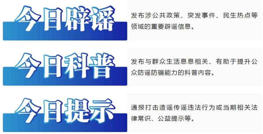 “今日辟谣榜”旨在传递事实真相,传播科学知识,帮助公众获得权威、准确的真实信息。栏目设置“今日辟谣”“今日科普”及“今日提示”三大版块,每日聚焦群众关心关切的重要辟谣内容,对涉及公共政策、突发事件、医疗健康等领域的网络谣言及时回应。