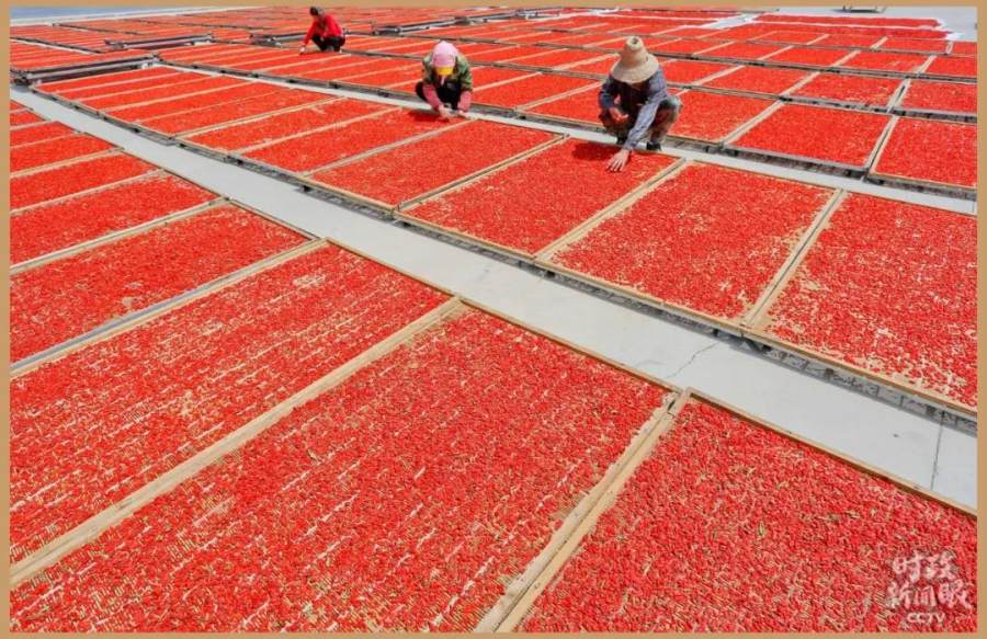 △甘肃张掖苗家堡村“扶贫车间”里,农户在晾晒枸杞。