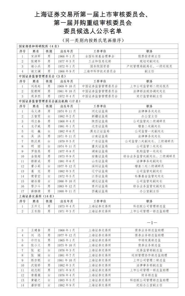 沪深交易所第一届上市审核委员会、第一届并购重组审核委员会名单公布。