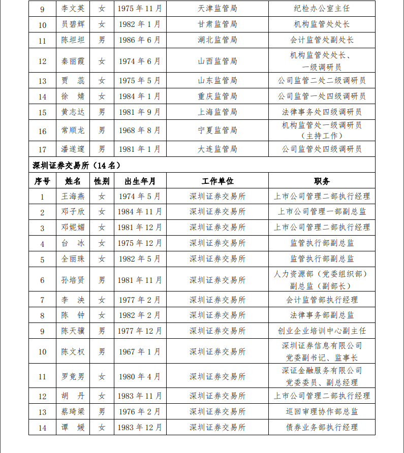 深交所方面,决定聘任王冬朴、孔祥杰、邓子欣、邓妮媚、甘宇晗、卢博、台冰、全丽珠、刘飞、刘地亮、刘翼鹏、孙静、孙培贤、苏艳霞、李文英、吴年文、员碧辉、张勇、陈钟、陈文权、陈坦坦、陈佳玲、邵蔚、胡丹、秦丽霞、徐婧、蔡琦梁为深交所第一届上市审核委员会委员。