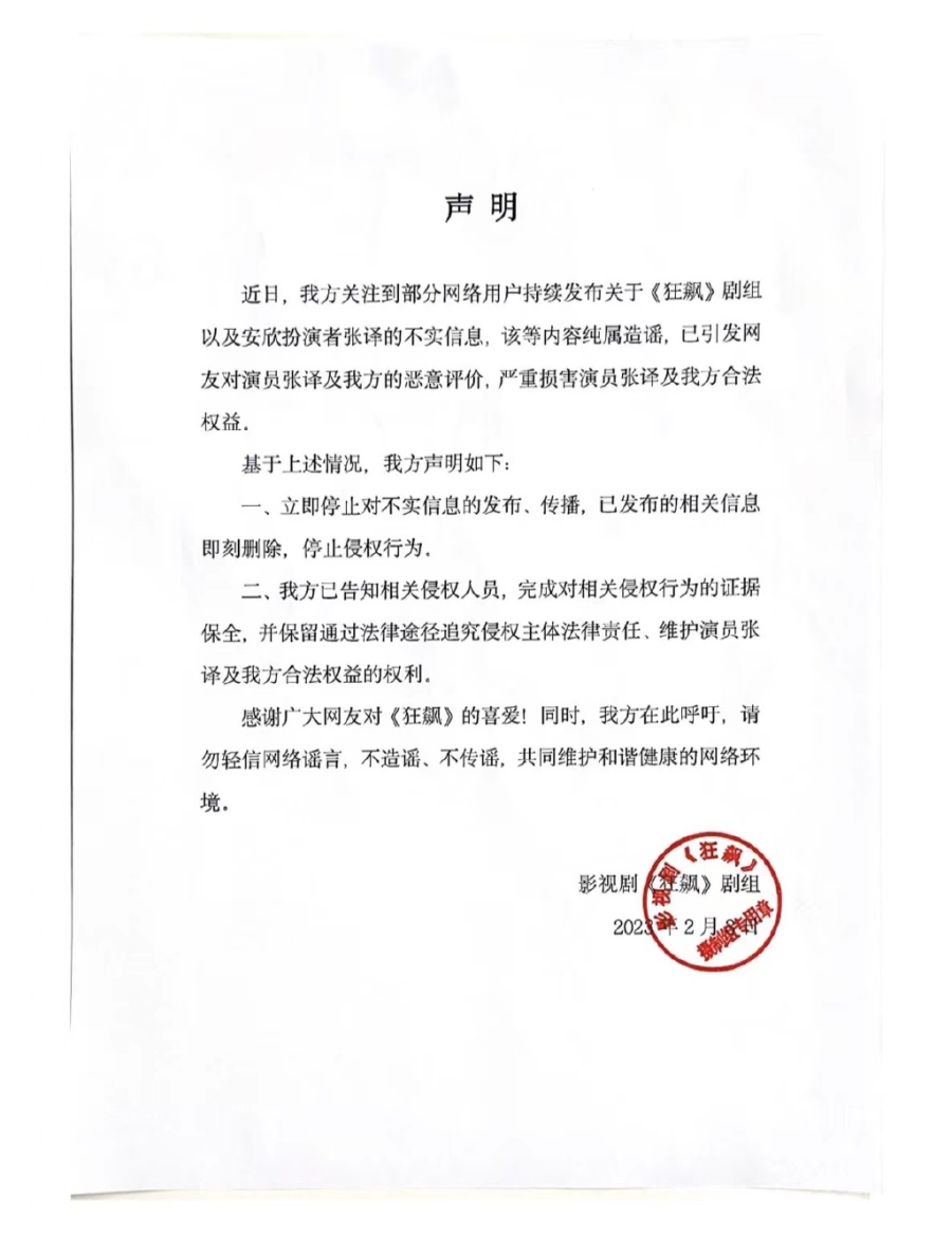 2月3日,狂飙官微发布声明,称部分网络用户持续发布关于《狂飙》剧组及“安欣”扮演者张译的不实信息,该等内容纯属造谣,已引发网友对演员和剧方的恶意评价,要求相关用户立即停止侵权行为,并保留依法追责的权利,同时呼吁大家勿轻信网络谣言,不造谣不传谣。