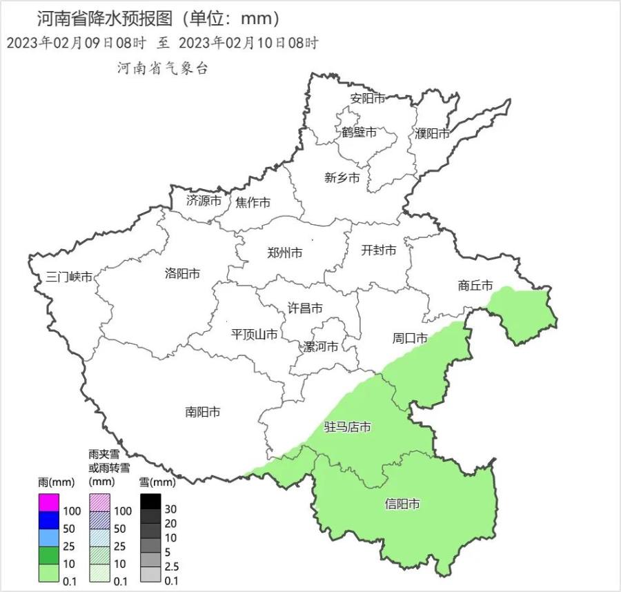 9日,黄河以南小雨或雨夹雪停止转阴天;其他县市多云。