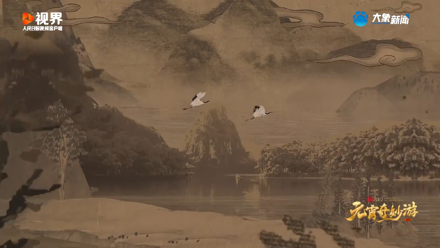 透过千载光阴缝隙缓缓铺展的一卷古画,云起楼图拨云见日,鸟瞰远望步入画中。挥毫泼墨间,白鹤点睛复活,穿越水墨丹青里的千里江山,翱翔于重重晕染下的恢弘长卷,化身为温润如玉的书生,挥袖、回首之间移步换景,将秀丽山川与古今建筑在翩然起舞中一一呈现。