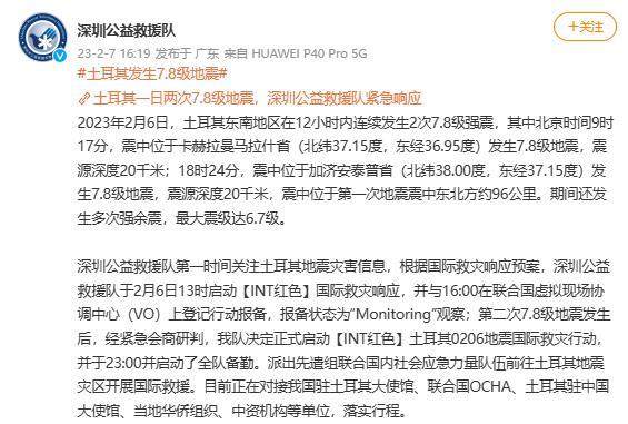 深圳公益救援队计划派出先遣组并联合国内社会应急力量前往土耳其地震灾区开展国际救援。目前正在对接我国驻土耳其大使馆、联合国OCHA、土耳其驻中国大使馆、当地华侨组织、中资机构等单位,落实行程。