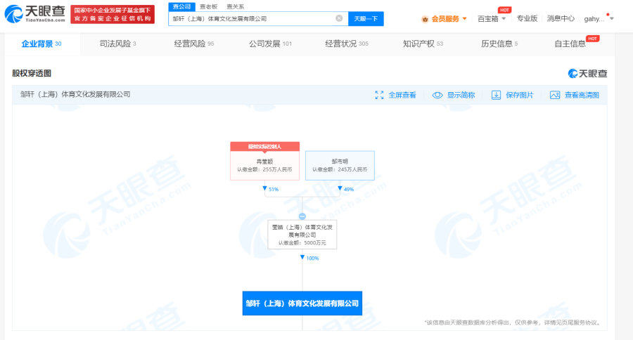 该公司成立于2016年12月,注册资本5000万人民币,法定代表人为冉莹颖,经营范围包括体育赛事策划、组织文化艺术交流活动、体育经纪人服务等。股东信息显示,该公司由莹皓(上海)体育文化发展有限公司全资持股,后者则由冉莹颖、邹市明共同持股。