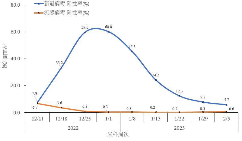 2022年第49周(12月9日),流感样病例新冠病毒阳性率开始逐渐增加,在第51和52周期间达峰值后持续下降,2023年第5周(1月30日-2月5日)新冠病毒阳性率已下降至5.7%;2022年第49周以来,流感病毒阳性率则逐步降低,至12月下旬降至极低水平,目前流感病毒阳性率维持在1.0%以下(图2-5)。