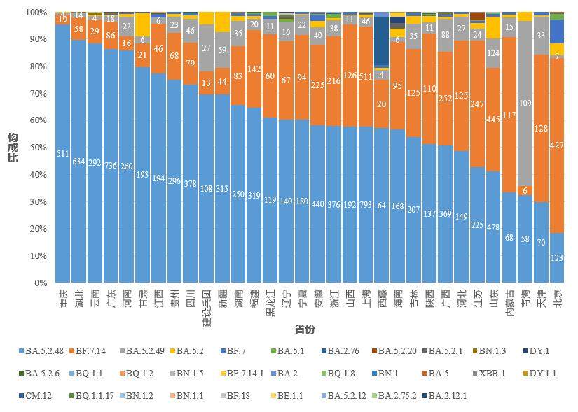 2.图中标记的数字分别为BA.5.2.48、BF.7.14和BA.5.2.49进化分支有效基因组序列数量。