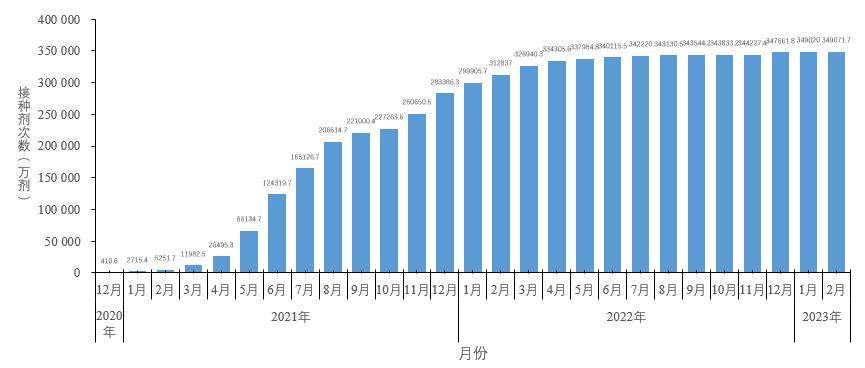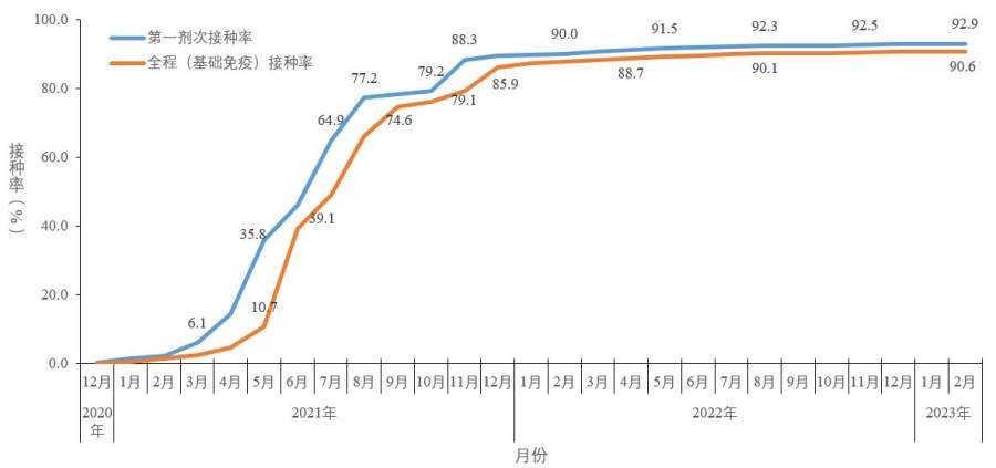 截至2023年2月6日,31个省(自治区、直辖市)和新疆生产建设兵团累计完成接种新冠病毒疫苗34.91亿剂次(图5-1)。全人群第一剂次、全程接种覆盖比例分别达到92.9%和90.6%(图5-2)。