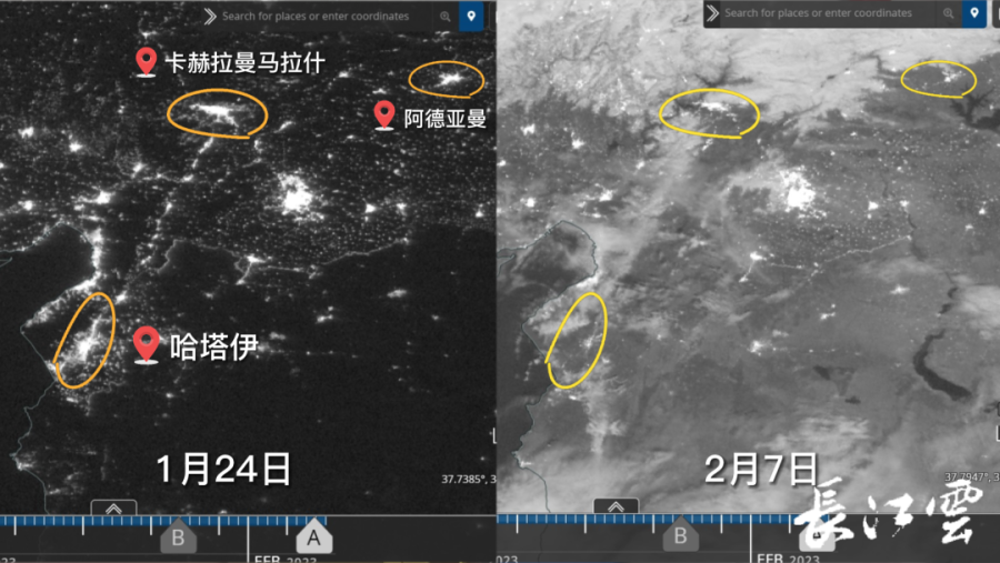 土耳其地震灾区1月24日与2月7日灯光对比。