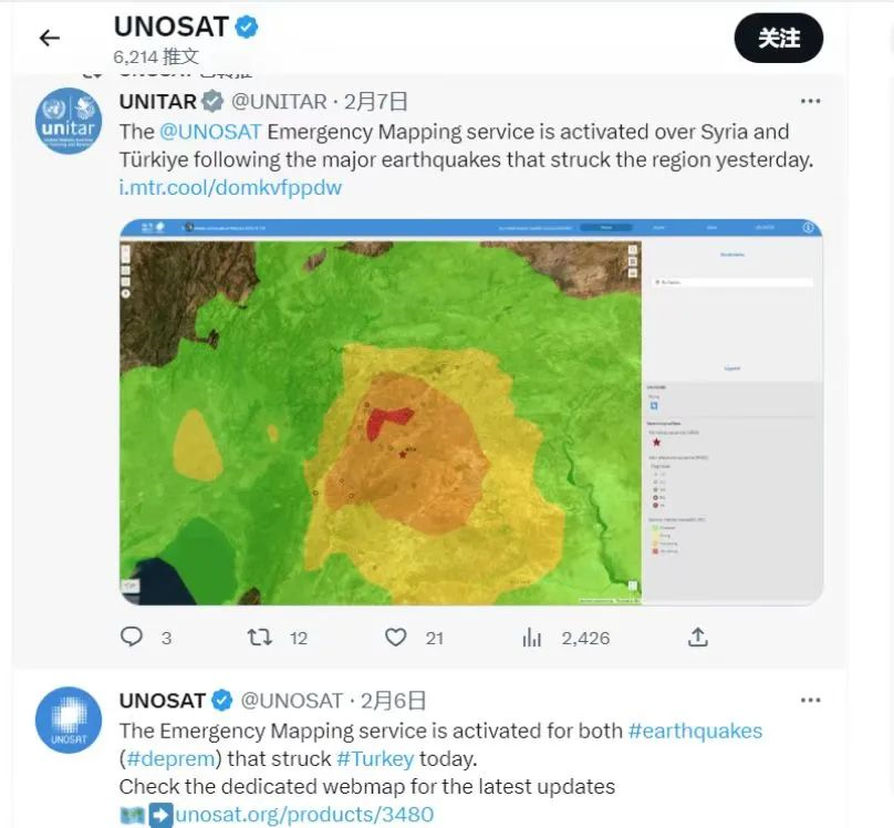 联合国卫星中心宣布激活面向土耳其地震的紧急制图服务。