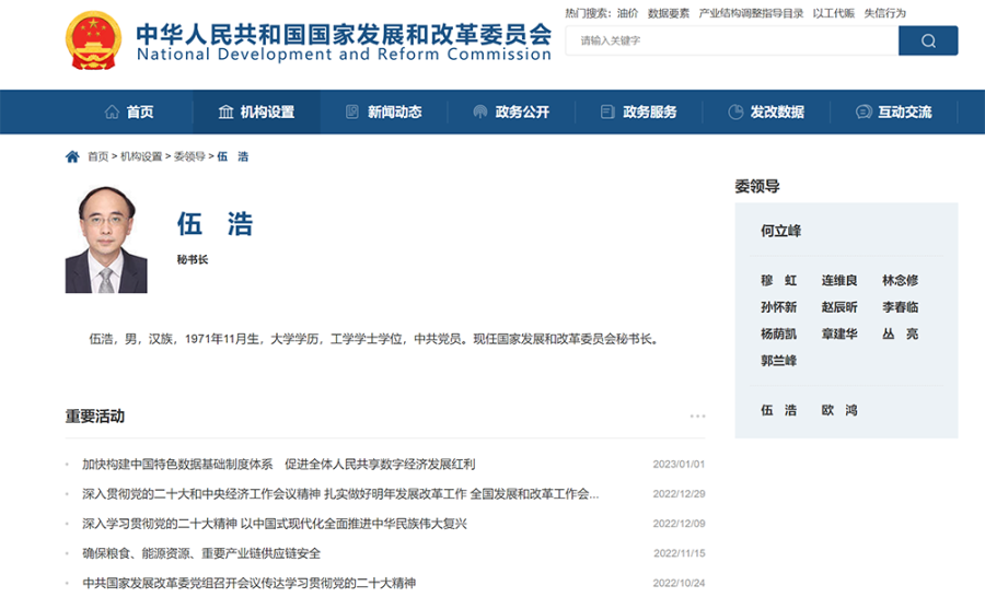 2月10日上午,记者查询发现,国家发改委官网“委领导”栏目近期更新后显示,伍浩已担任国家发改委秘书长。