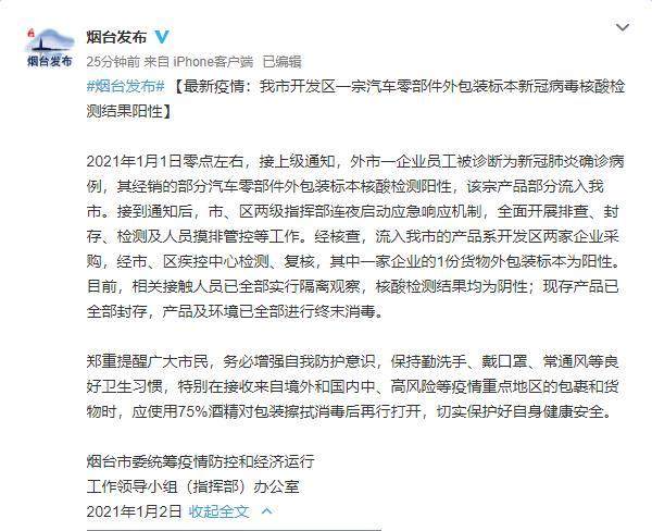 2021年1月2日早8点04分,“健康烟台”公众号发布消息:2021年1月1日零点左右,接上级通知,外市一企业员工被诊断为新冠肺炎确诊病例,其经销的部分汽车零部件外包装标本核酸检测阳性,该宗产品部分流入我市。接到通知后,市、区两级指挥部连夜启动应急响应机制,全面开展排查、封存、检测及人员摸排管控等工作。