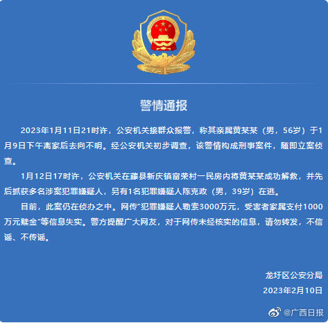 2月10日,广西梧州龙圩区公安分局发布一则警情通报:2023年1月11日21时许,公安机关接群众报警,称其亲属黄某某(男,56岁)于1月9日下午离家后去向不明。经公安机关初步调查,该警情构成刑事案件,随即立案侦查。