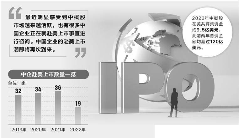 事实上,从2022年全年来观察,中企赴美上市可谓用跌入冰点来形容,根据证券时报记者统计,2022年共有19只新股上市,其中包括4家特殊目的收购公司(SPAC),在去年9月和10月,更是罕见地出现赴美上市中国企业连续两个月为零。2019年到2021年,赴美上市企业数量分别有32家、34家和36家。不仅上市数量减少,募集资金同样下降明显。记者统计发现,2022年中概股在美共募集资金约9.5亿美元,此前两年募资金额均超过120亿美元。直到去年年末,情况开始有所改变。亚朵集团和雷亚电源分别在11月和12月上市。