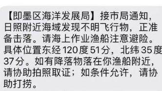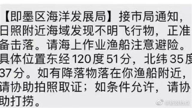 网传截图显示,即墨区海洋发展局发出通知称,接市局通知,日照附近海域发现不明飞行物,正准备击落。请海上作业渔船注意避险,具体位置东经120度51分,北纬35度37分。这份通知中还提到,如有降落物落在渔船附近,请协助拍照取证;如条件允许,请协助打捞。