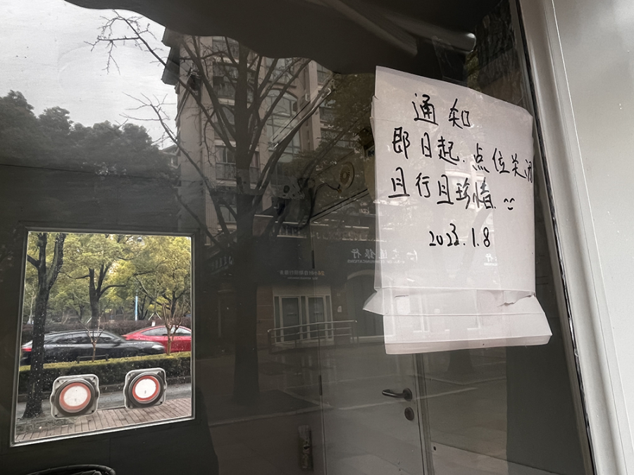 上海宝山长江西路上,一家核酸采样亭的窗玻璃上贴着一张硬板纸,落款留在了2023年1月8日。亭身仍留着“热闹时”大大小小的纸质告示,仿佛遭遇了“时间停止”。