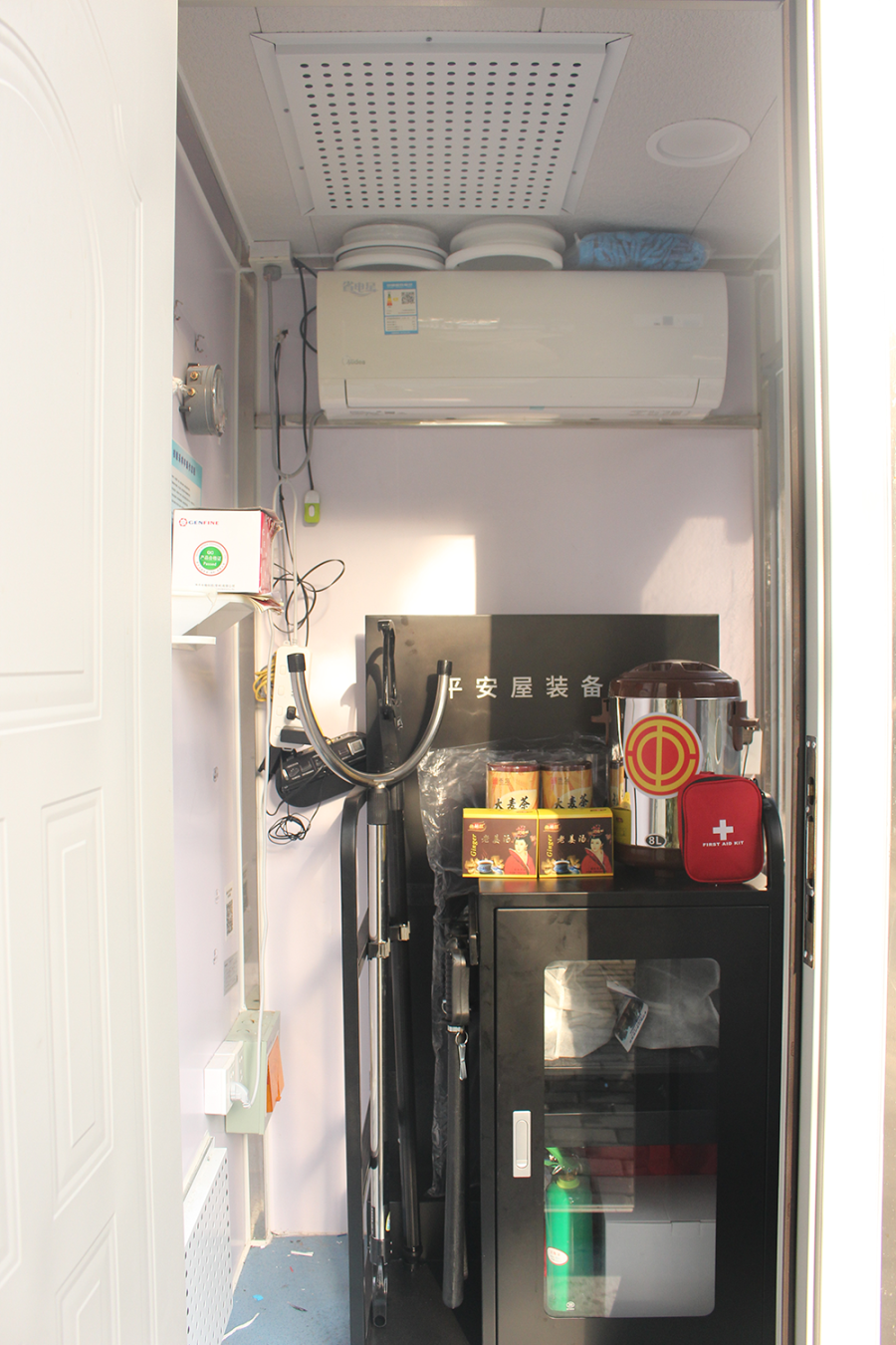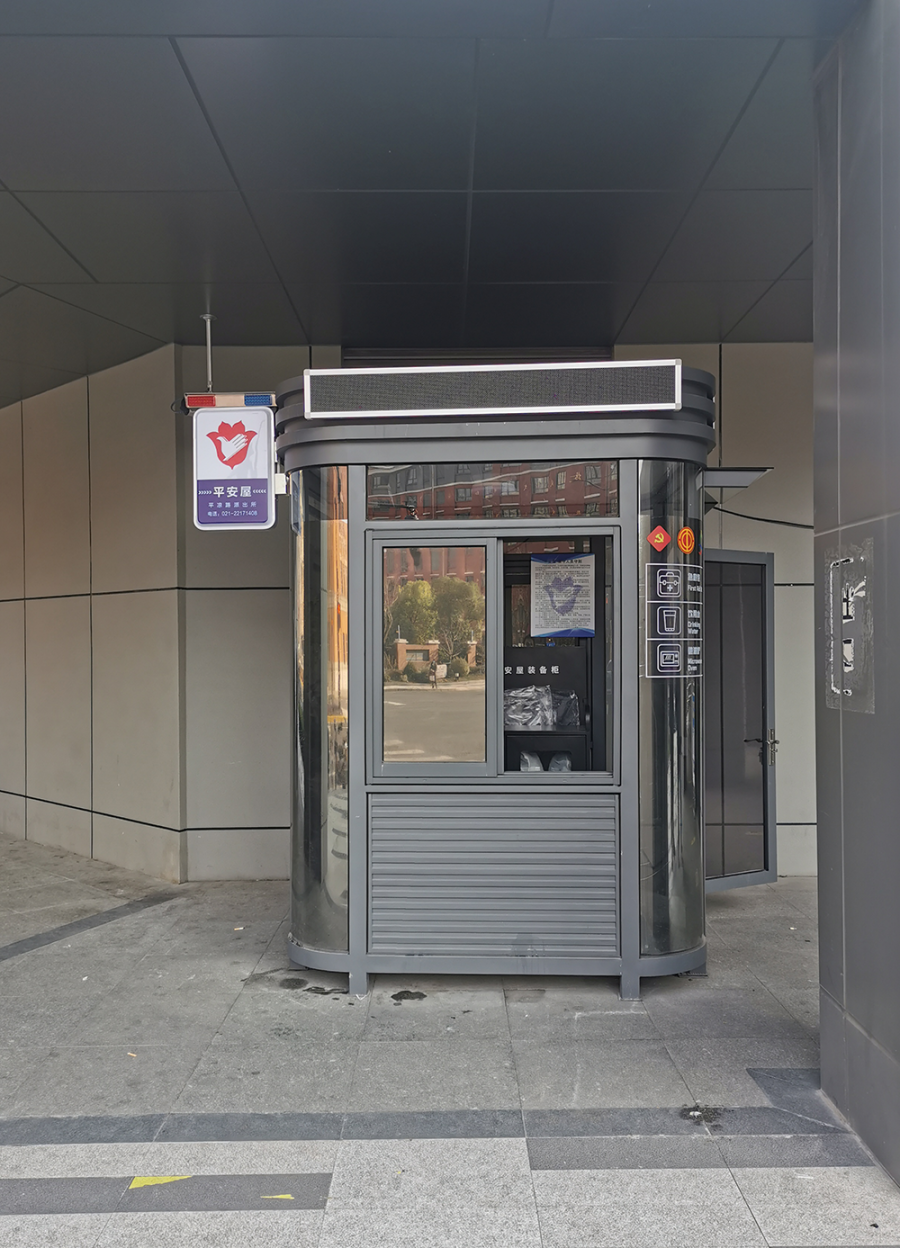 核酸采样亭变身后,根据公安部门对平安屋建设的要求,配备警棍、盾牌、灭火器、应急手电筒等防暴装备和消防设备。屋外安装标识灯箱和红蓝警灯,配备“一键式紧急报警”系统,集巡逻值守、危机预警、应急处置、安全庇护等功能于一身。