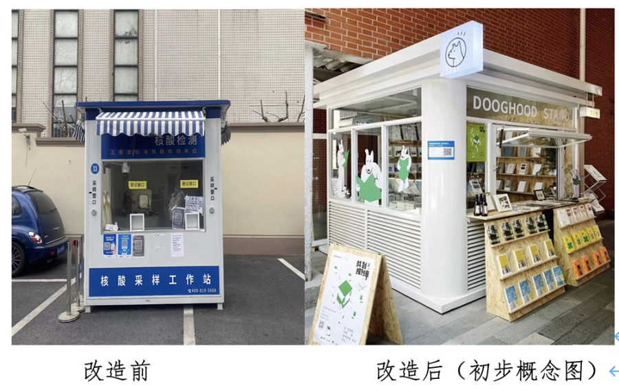 而设置在普陀区枣阳路上的核酸采样亭,以及位于白玉大楼122号健身点对面的核酸采样亭,未来将分别升级为自助咖啡饮料亭、爱心格子屋。