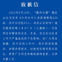 2月13日,@衢州交警在线发文:2023年2月10日,“衢州交警”微信公众号发布《今年全市已查获酒醉驾 624起,其中女司机25人,有你认识的吗?她们最高的喝了多少?》 (已撤除),引发网友和媒体的关注。2月13日,衢州交警发表致歉信:在此,我支队对自身工作不严谨造成的不良影响,向广大网友致歉。在今后的工作中,我们将汲取教训,加强内容把关,杜绝类似情况再次发生,希望广大网友和媒体继续监督、支持交警工作。