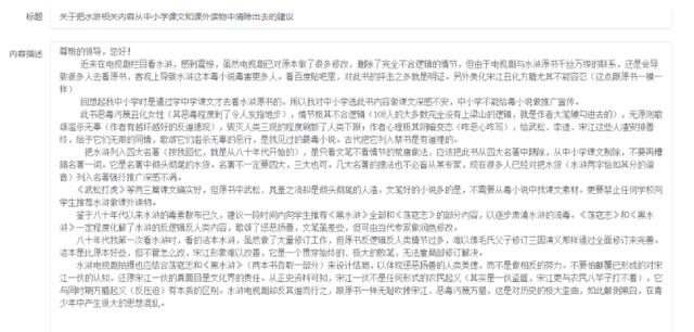 最后,该网友认为,“《武松打虎》等两三篇课文确实好,但原书中武松、晁盖之流却是彻头彻尾的人渣。文笔好的小说多的是,不需要从毒小说中找课文素材。更要禁止任何学校向学生推荐水浒做课外读物。”