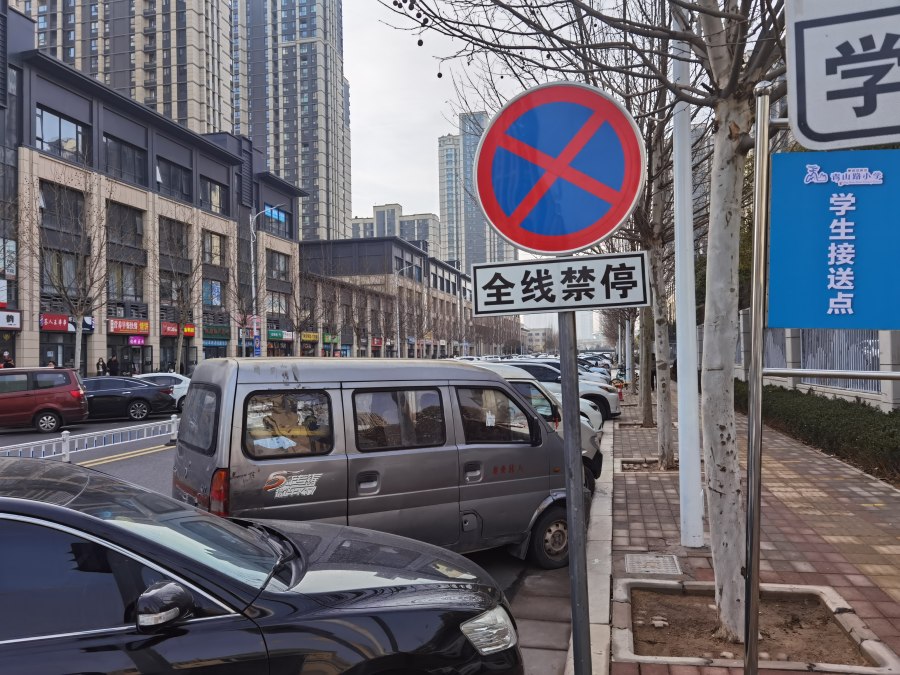 附近居民出行以及学生上学放学都要从此段道路通过,虽然相关部门在此设置了“全线禁停”交通标识,学校围墙上也悬挂了明显的禁停提示牌,但是沿路口向南仍有一条长龙似的车队斜插入道路两侧,甚至路中部分区域也被违停车辆占据。