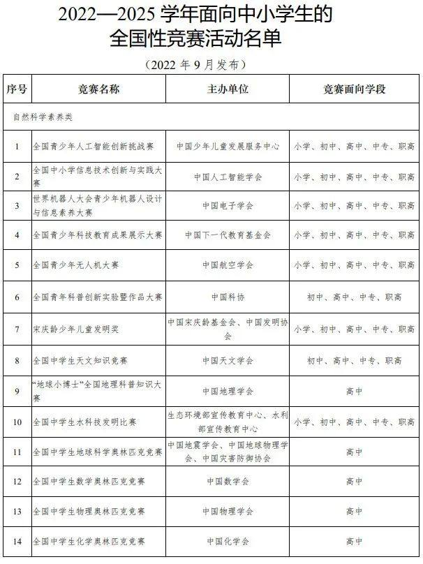 现再次提醒广大学生家长:参加面向中小学生的全国性竞赛活动务必认准教育部门户网站公布的《2022—2025学年面向中小学生的全国性竞赛活动名单》(教监管厅函〔2022〕13号)(该名单是经教育部审批通过的由事业单位、社会组织举办的竞赛,教育行政部门举办的竞赛活动按行政单位办赛程序进行审批,不列入该名单),不要参加违规竞赛,谨防上当受骗、遭受损失。