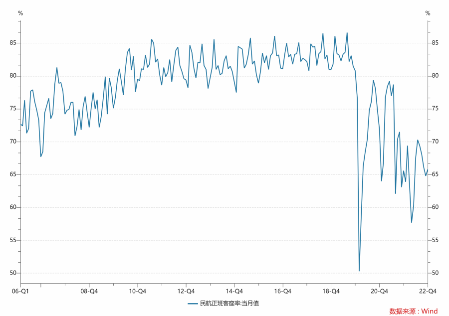 Wind数据显示,在2019年之前,我国的民航正班客座率一直在80%至85%之间波动。2022年我国的民航正班客座率保持在65%左右波动,其中去年7月份一度上升到70%,但随后出现了下滑。